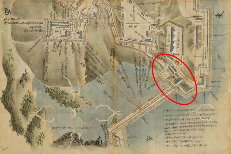 築城当初の富岡城は石垣造りの近世城郭でしたが、縄張り的に問題があり、天草の乱では籠城戦で苦労しました。入江が城の奥まで入り込んでいるため、一揆勢は舟を着けてそこから攻め込みました。また、地続きである陸側からの攻撃への備えがなく、井戸も三の丸と城外にしか設けられていませんでした。